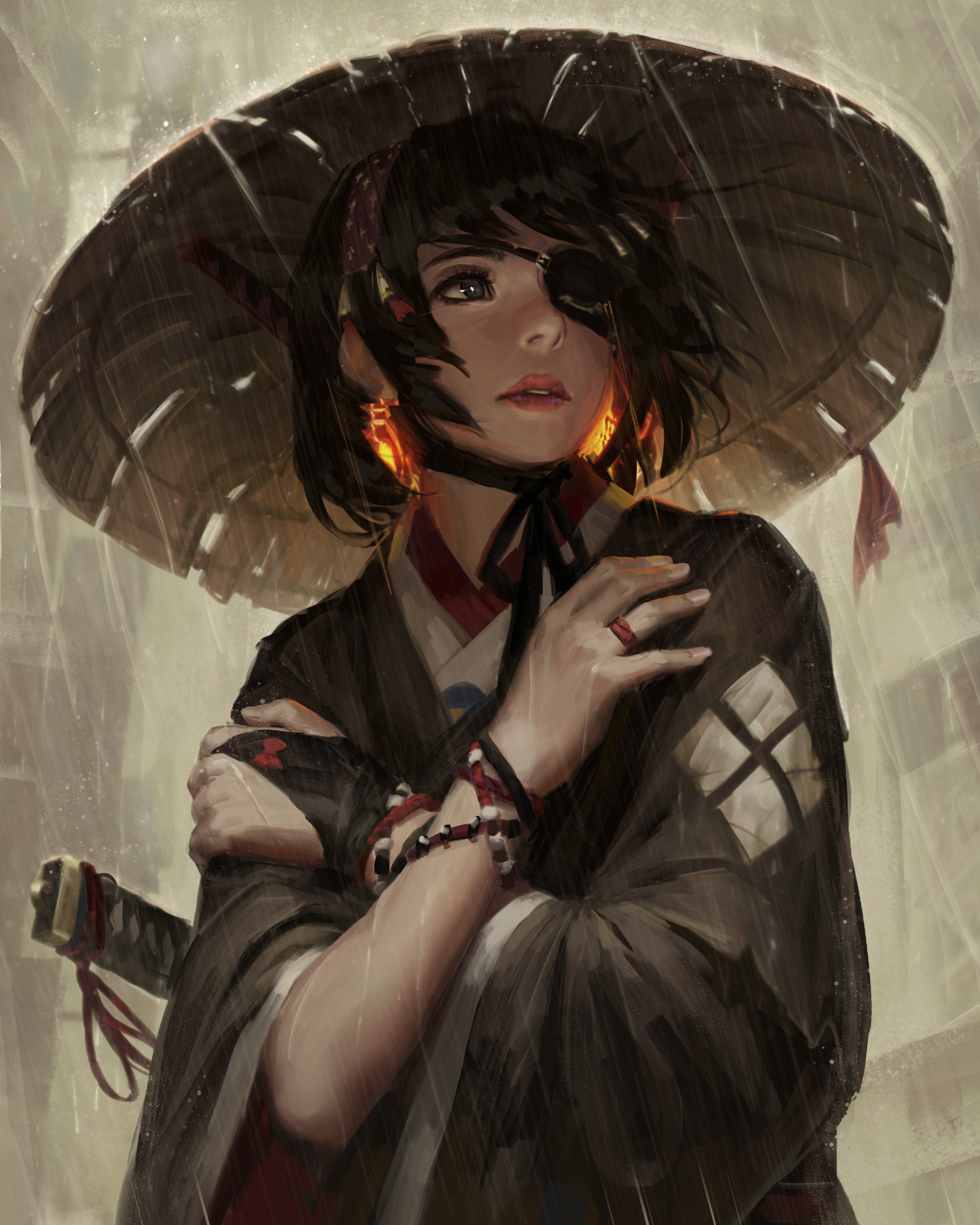 Artwork, mantle, white hair, samurai, rain, guweiz, katana, women. Filters normal mode strict mode list all children. Long hair, artwork, sarashi, samurai, earring, drawing, warrior, black hair, guweiz, fantasy art, looking away, fantasy girl, digital art, gloves, fan.